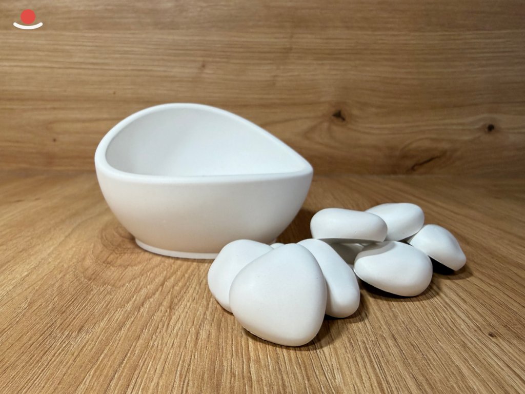Pokud hledáte doplněk, který se přirozeně adaptuje na jakýkoli styl interiéru, Bílý Mizu se sadou 12 bílých aromakamínků je tou nejpřirozenější volbou. Hluboká a asymetrická miska o průměru 10 cm ukrývá dvanáct drobných prvků, které dohromady tvoří čistou, nekomplikovanou kompozici. Díky své sněhově bílé barvě se tento set hodí skutečně všude – od moderních skandinávských obýváků až po čisté prostředí koupelen či ložnic. Mizu není jen aromakámen, je to tichý a elegantní objekt, který dává vyniknout kráse poctivé ruční práce a přírodních materiálů bez zbytečných barevných vjemů.