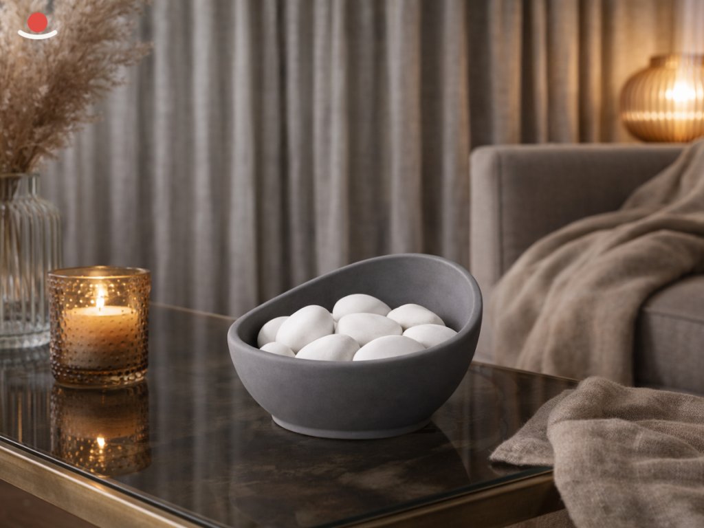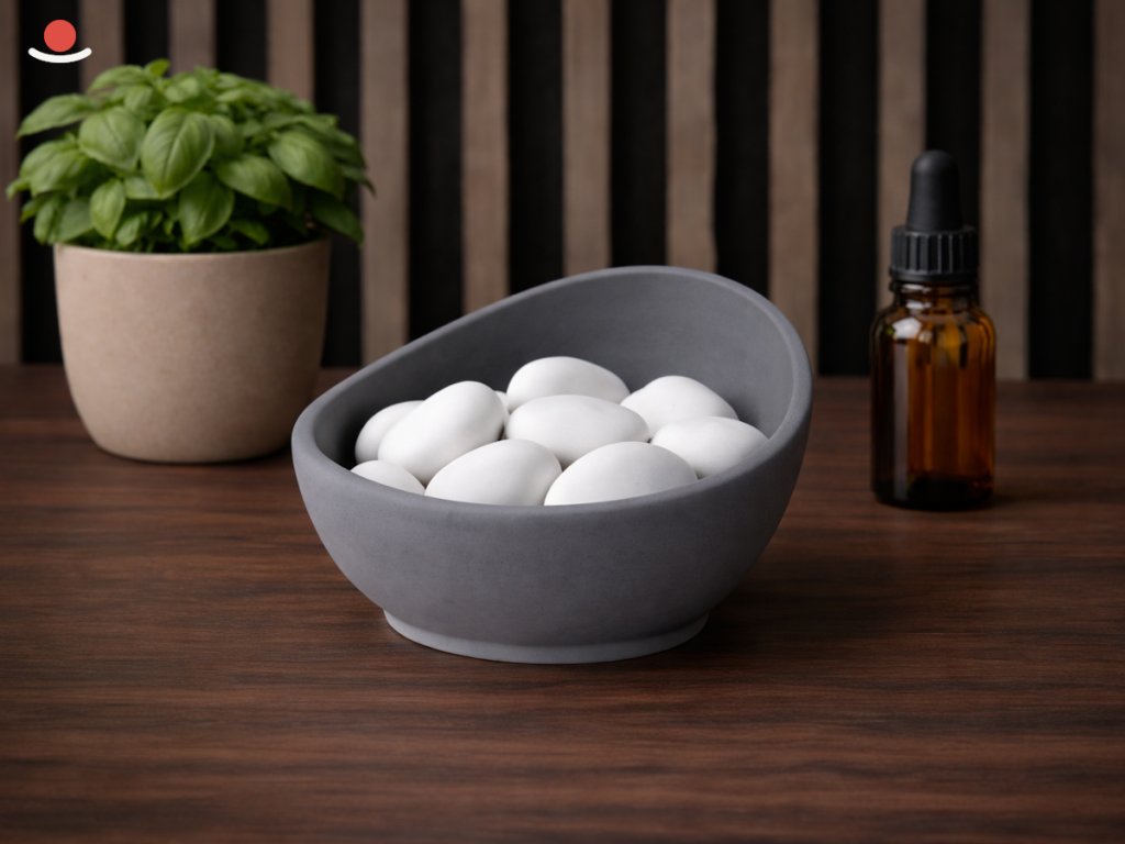 Tmavý Mizu s bílými kamínky s průměrem 10 cm není žádný lapač prachu. Hluboký profil asymetrické misky o výšce 7 cm funguje jako bezpečný prostor pro dvanáct samostatných kamínků, které si v misce můžete přeskládat, jak vás zrovna napadne. Skvěle sedí k betonu, sklu nebo k hrubě opracovanému dřevu. Žádné plasty, žádná levná produkce – tohle je poctivá ruční práce, která má svou váhu a texturu. Pokud hledáte způsob, jak do moderního bytu dostat vůni a zároveň tam nechat kousek industriální syrovosti, Mizu je trefa do černého.