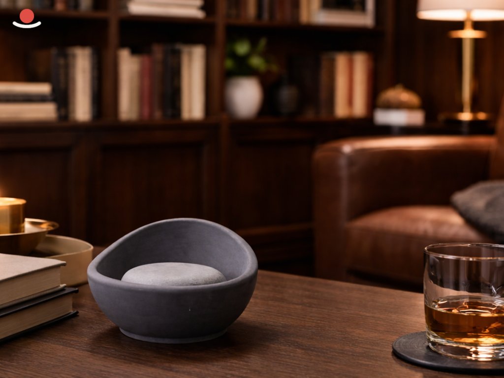 Tmavý Mizu se šedým aromakamenem a průměrem misky 10 cm není jen o vzhledu, je to funkční kus hmoty. Asymetrický tvar misky Mizu (japonsky voda) schválně narušuje sterilitu moderních interiérů, zatímco hloubka 4 až 7 cm spolehlivě kryje aromakámen. Skvěle sedne na pracovní stůl z masivu, vedle monitoru v moderním loftu nebo na betonovou polici v koupelně. Šedý povrch kamene i misky má svou specifickou, haptickou texturu, která z každého nanášení oleje dělá hmatatelný zážitek. Pokud hledáte designový prvek, který přežije trendy, Mizu je sázka na jistotu.